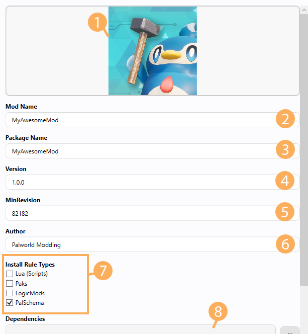 7. Install Rule Types: This is where you can change the type of your mod, for example if you had a PalSchema mod, but later you decide that you want it to also contain a .pak file, you would tick the Paks checkbox.