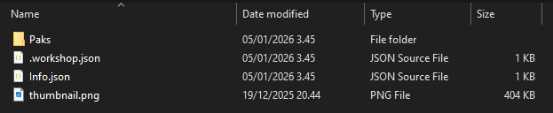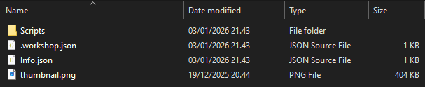 If the mod creation succeeds, a new folder with numbers is created which is your workshop item's id and the folder will automatically open up in File Explorer. You should now have the following items in your new folder: