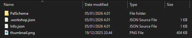 Info.jsonwhich is the file that contains metadata about your mod like Mod Name, Author, Version, InstallRules and more.thumbnail.pngwhich is the thumbnail for your mod on the workshop (File size must be under 1MB, otherwise you will get the errork_EResultLimitExceededwhen trying to upload)- A folder for the selected type (Scripts/, Paks/, LogicMods/, PalSchema/)