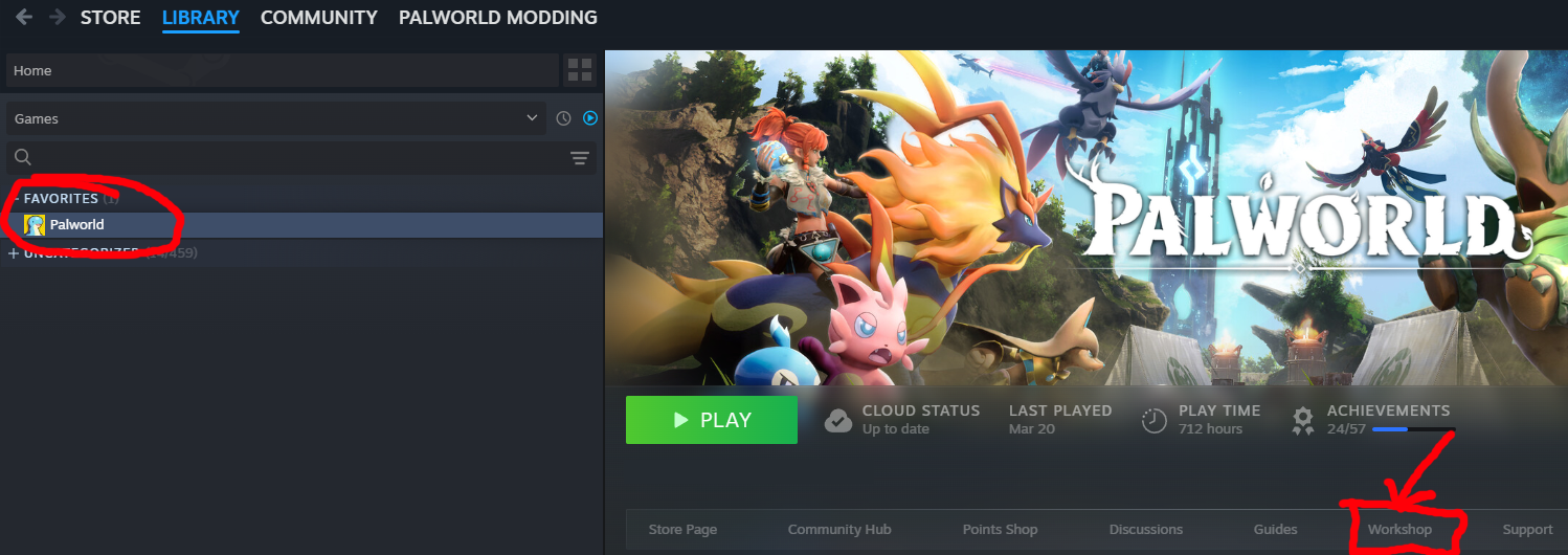 Let's start by looking for some mods. You have two ways to get to the Palworld's Workshop page which is either by navigating from the Steam client or from within Palworld itself. We'll just use the Steam client for now.