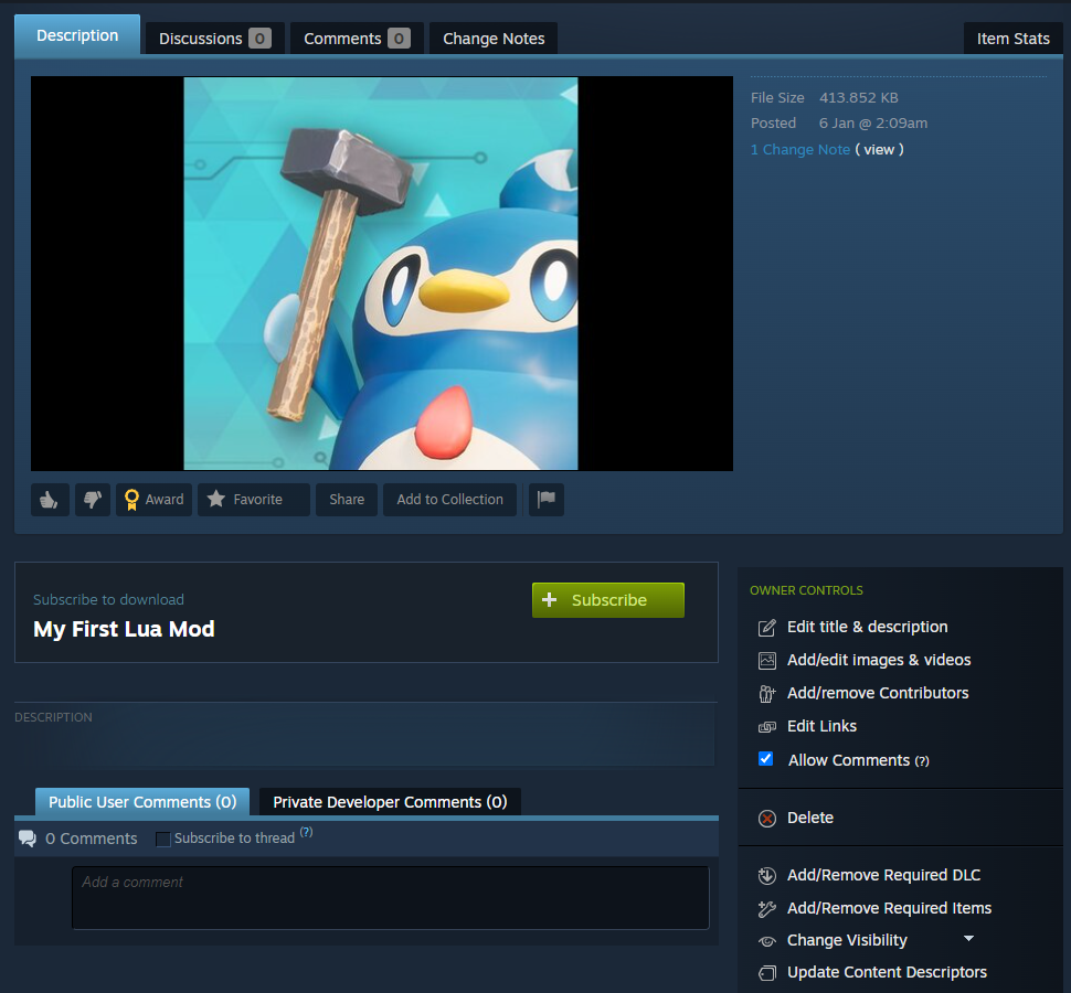 Notice that the visibility is automatically set to Hidden by default for new workshop items. This allows you to test your mod locally before making it public for everyone to download!